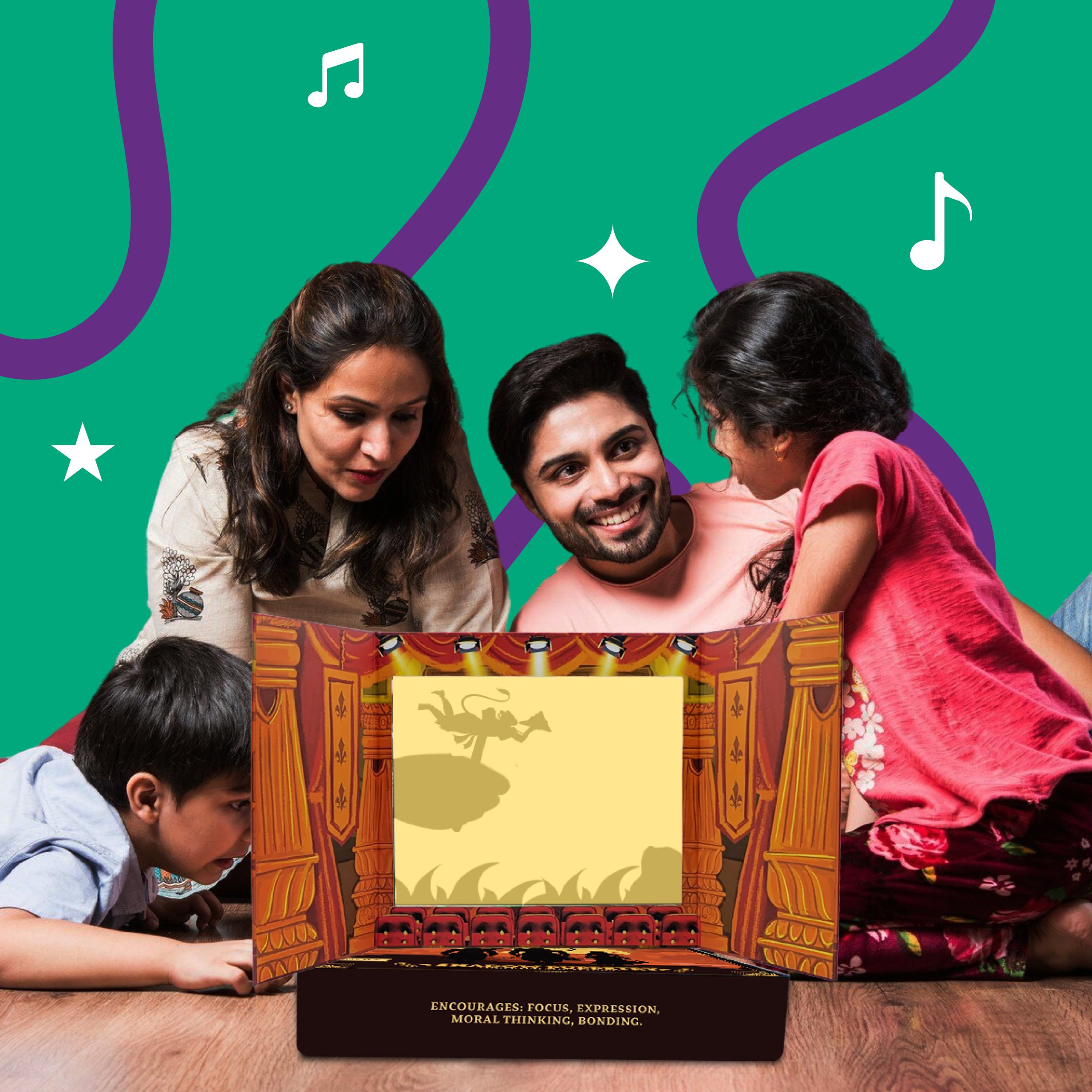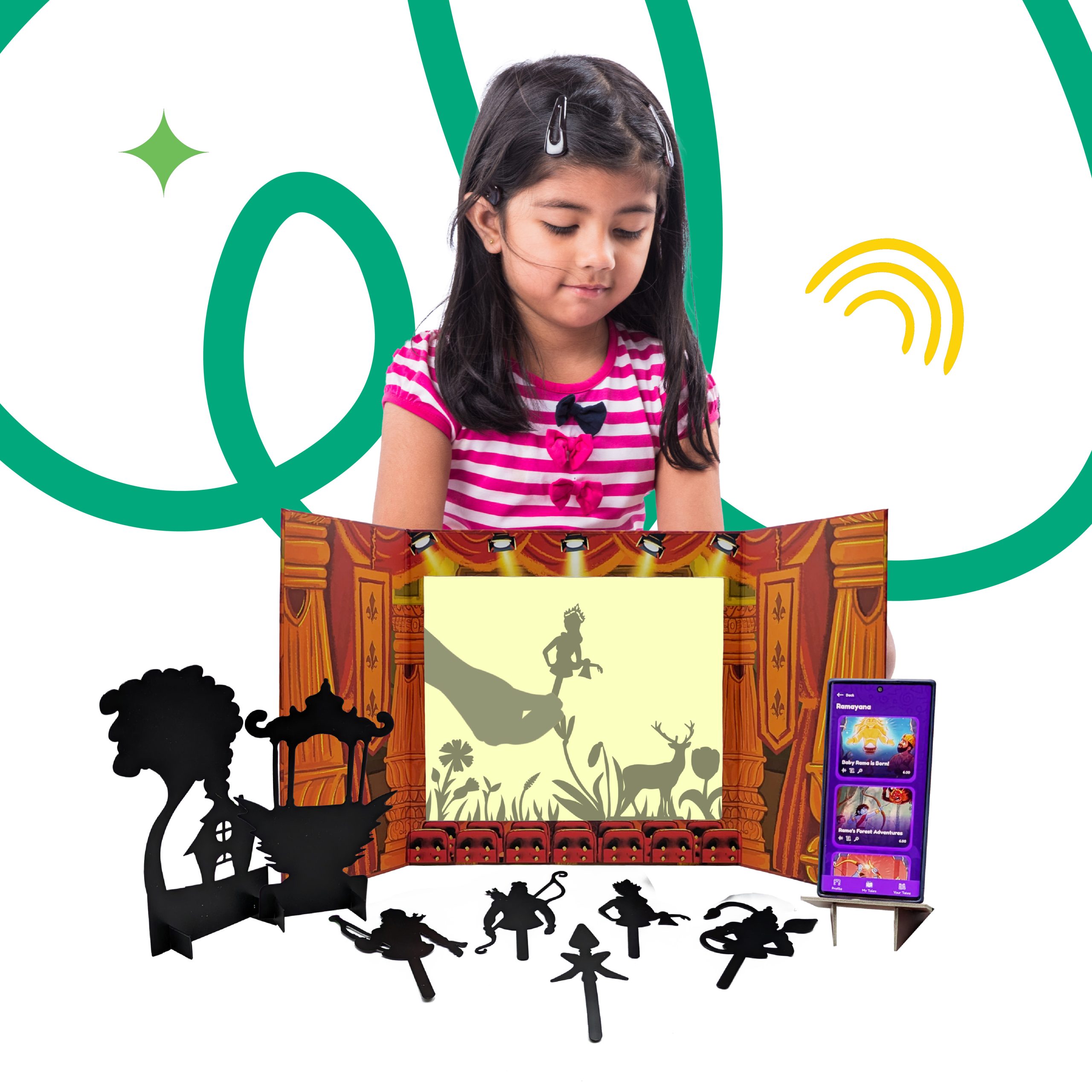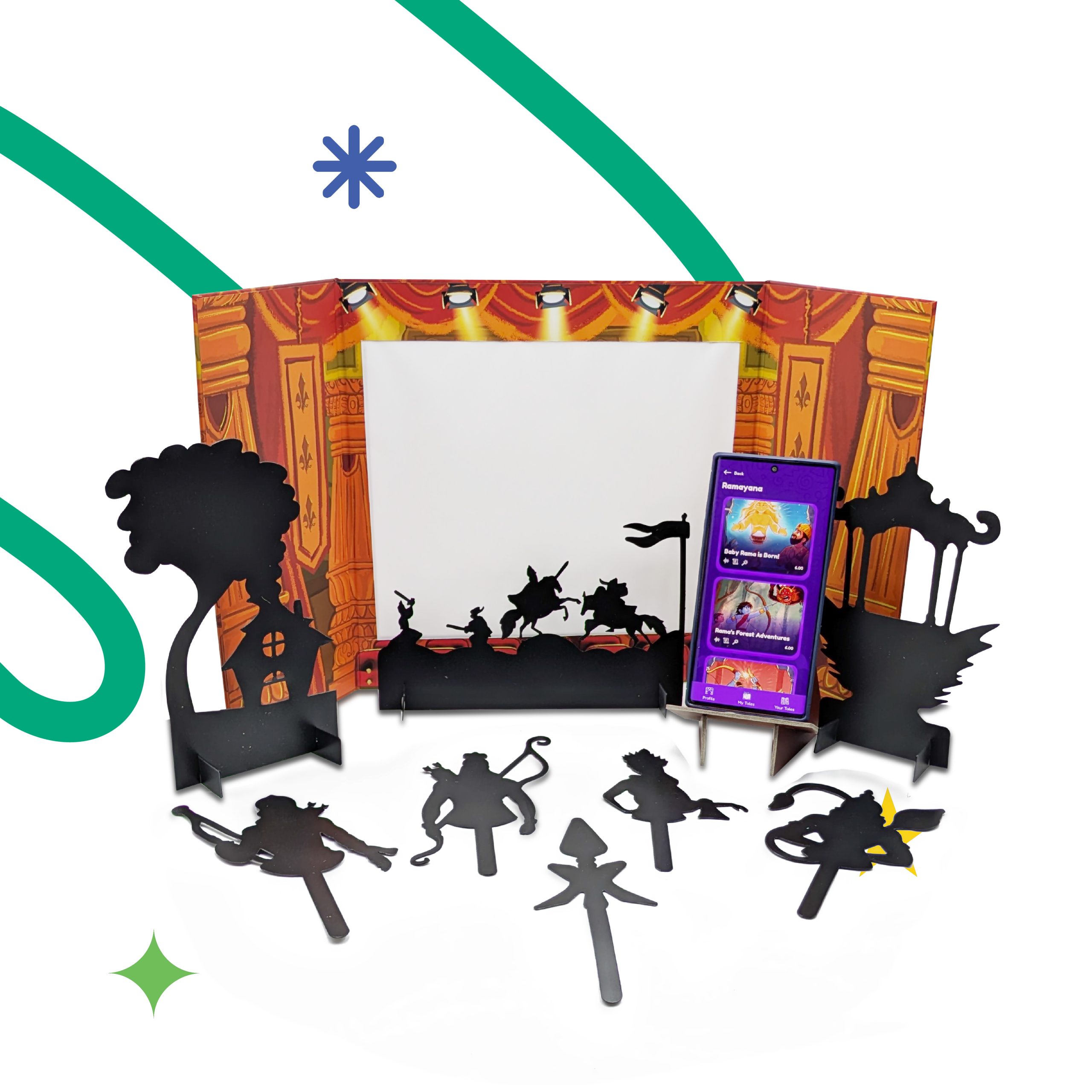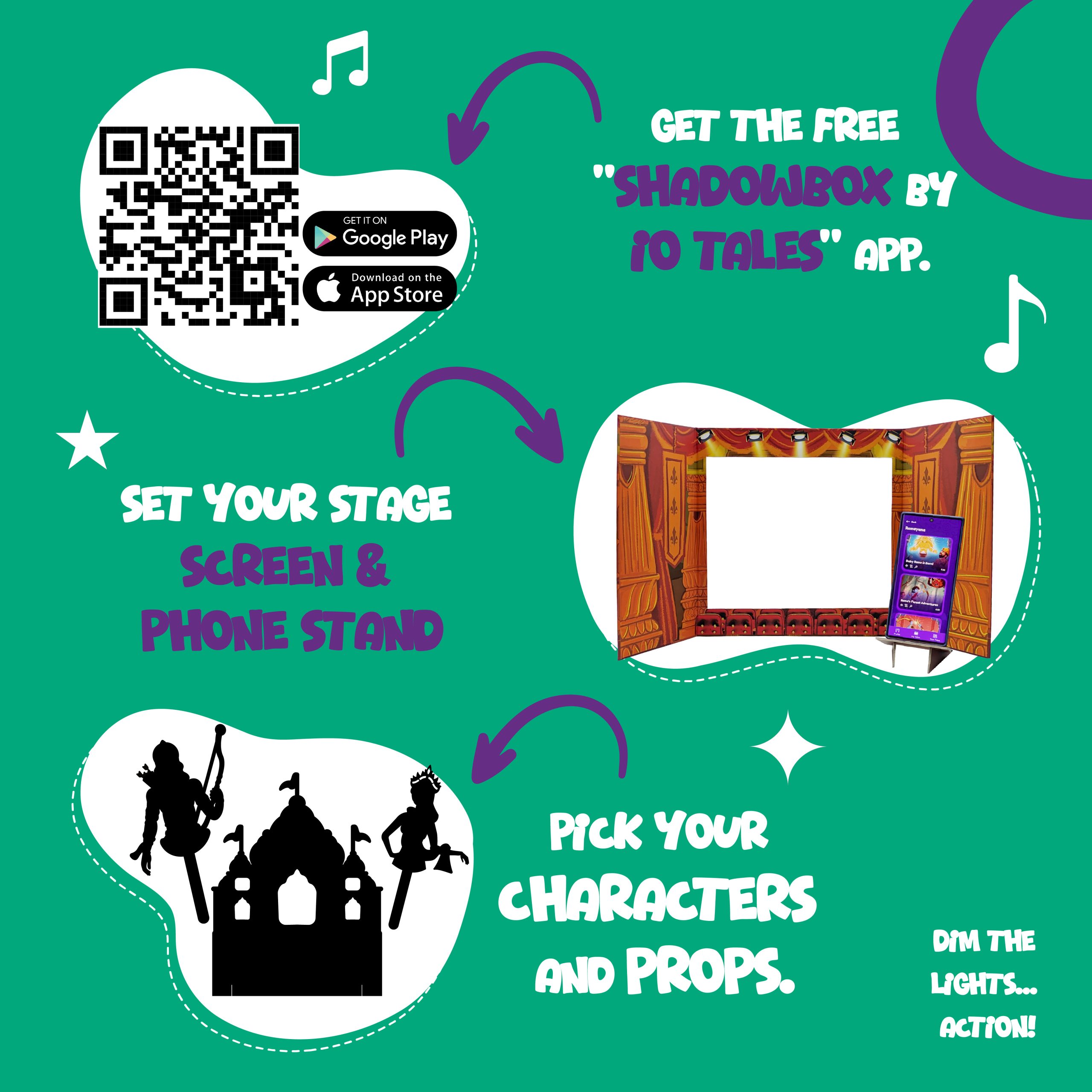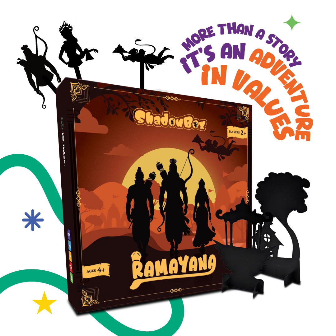 Step into the timeless world of the Ramayana with the ShadowBox. This interactive storytelling kit is designed to spark imagination, bringing the epic tales of Rama, Sita, Hanuman, and Ravana to life through light, sound, and creative play.